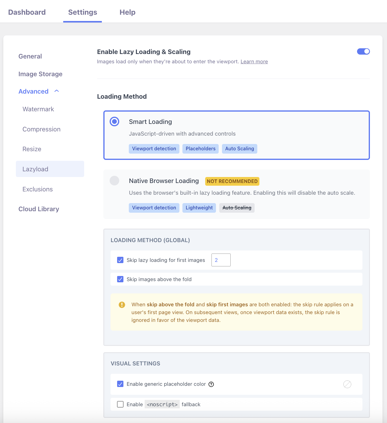 - Lazy Loading Behavior - avoid lazy loading for some of the first images. Use "Skip Lazy Loading for Initial Viewport" (recommended), or enter a number to exclude the first X images. Enable lazy loading for all images - learn more