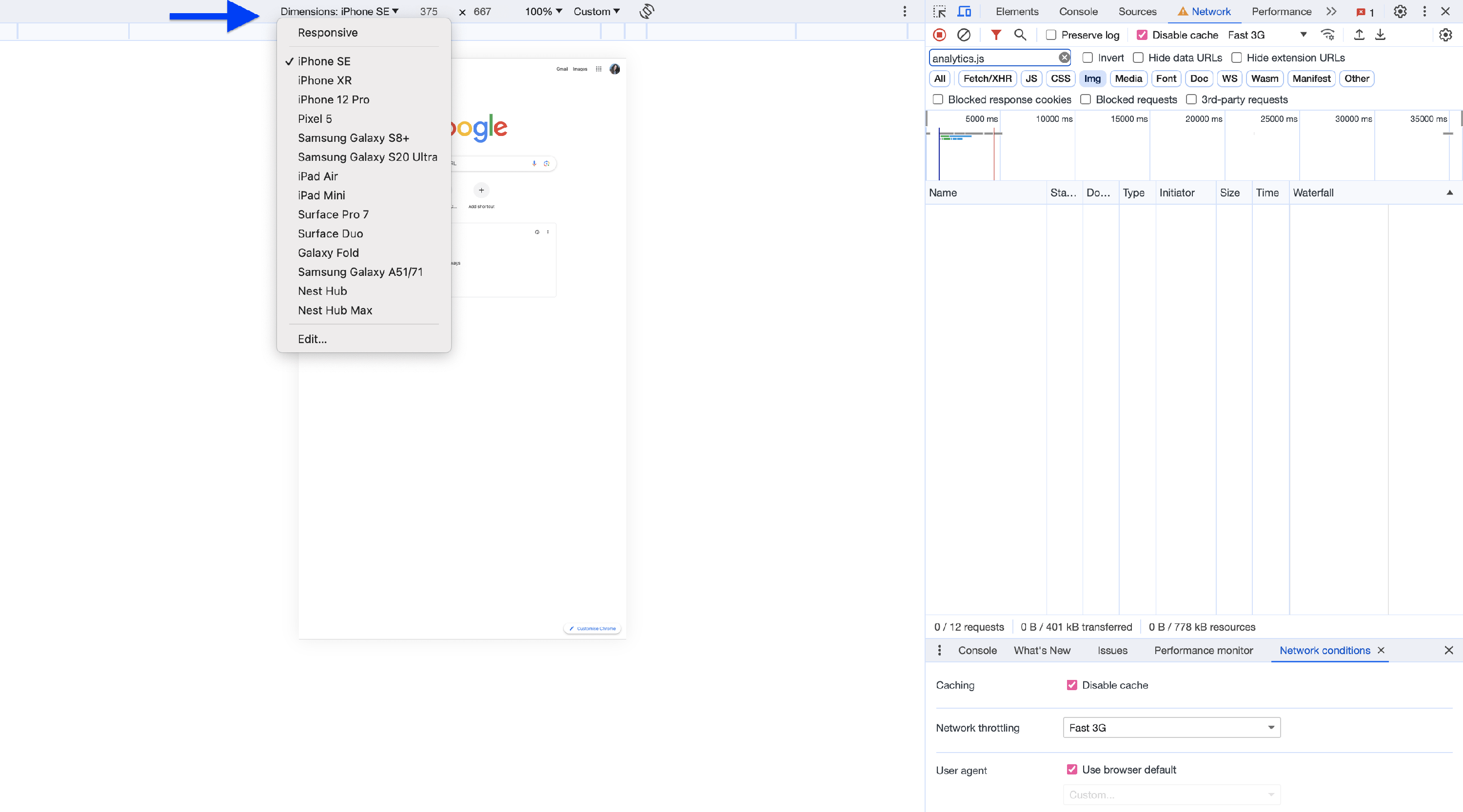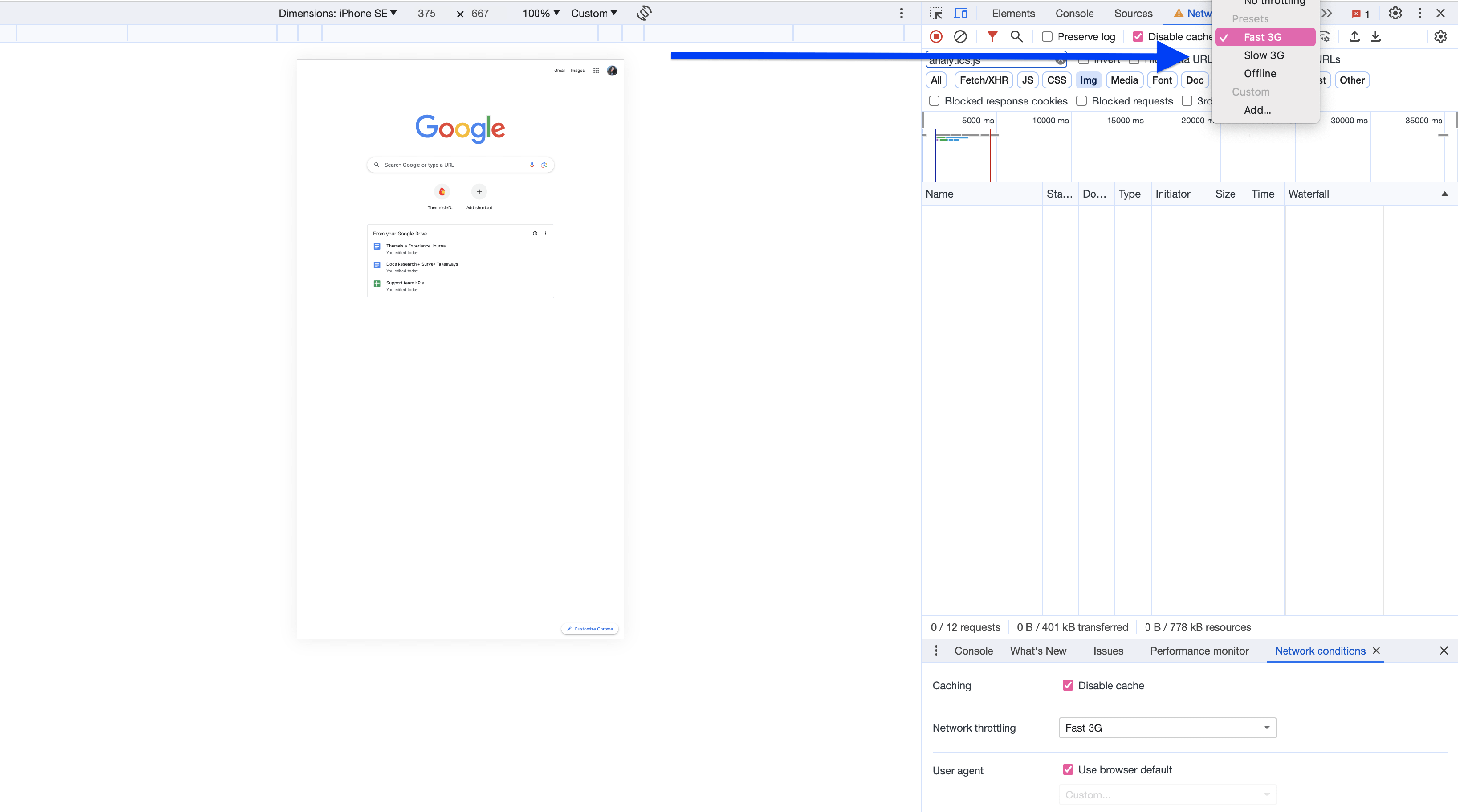 4 Next to Disable cache, open the dropdown and select Fast 3G.
