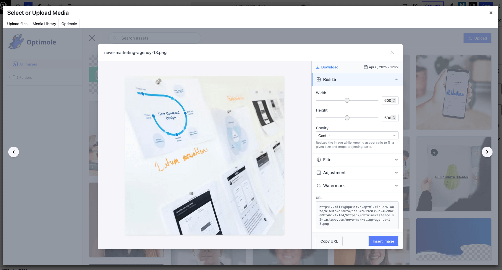 Using the Dashboard Management, you also have access to Optimole image editing options inside the WordPress editor.