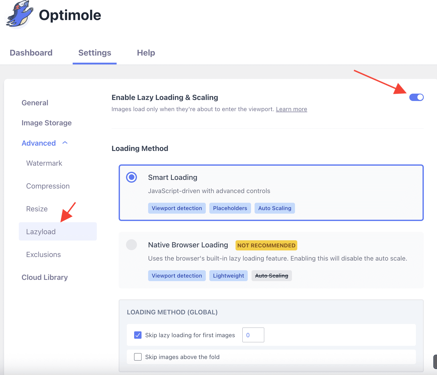 In Optimole, there is a common toggle to enable scale images and lazy load in Optimole > Settings > Advanced > Lazyload.