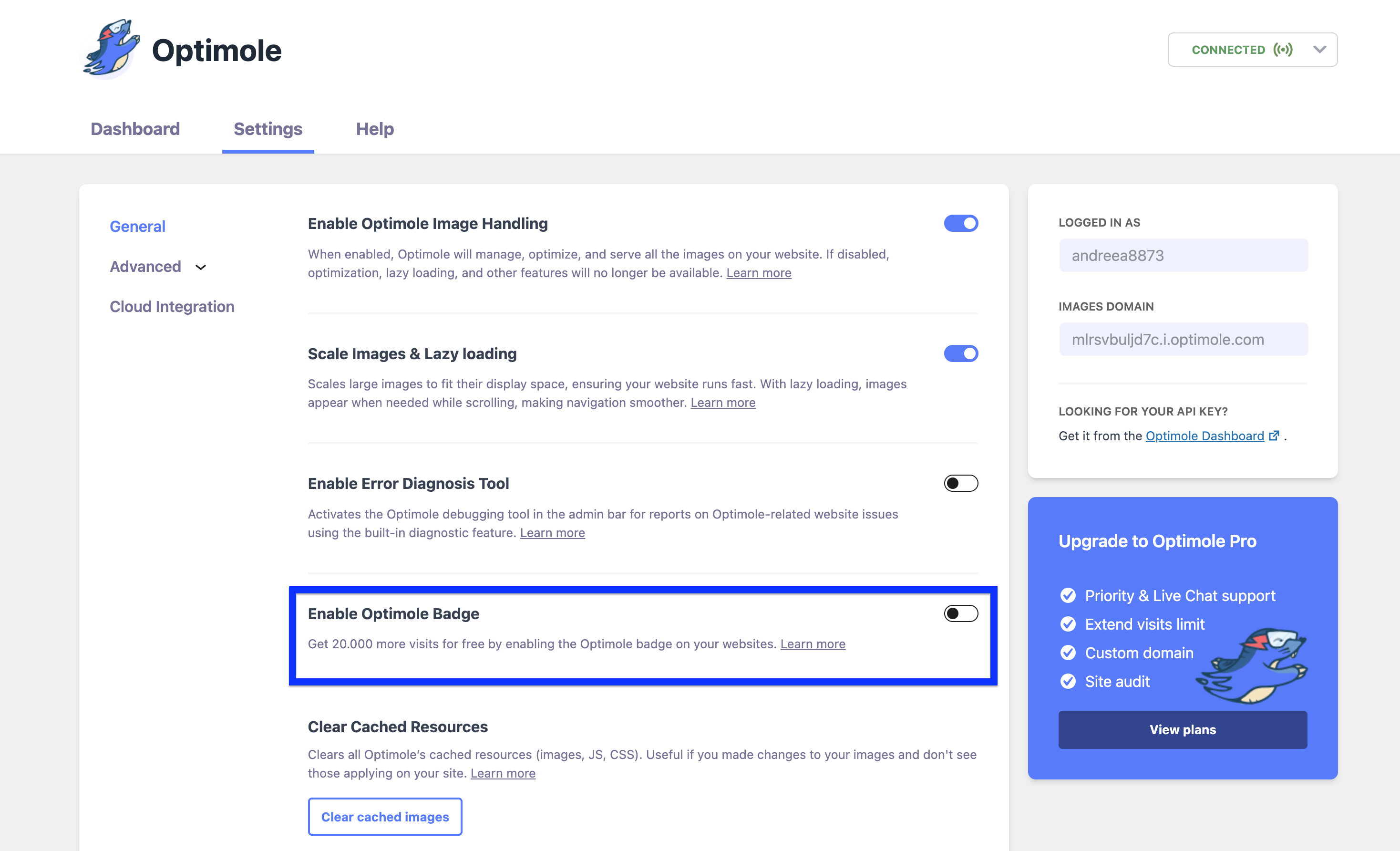 3 Verwenden Sie den Schalter, um die Funktion Optimole-Abzeichen aktivieren einzuschalten.