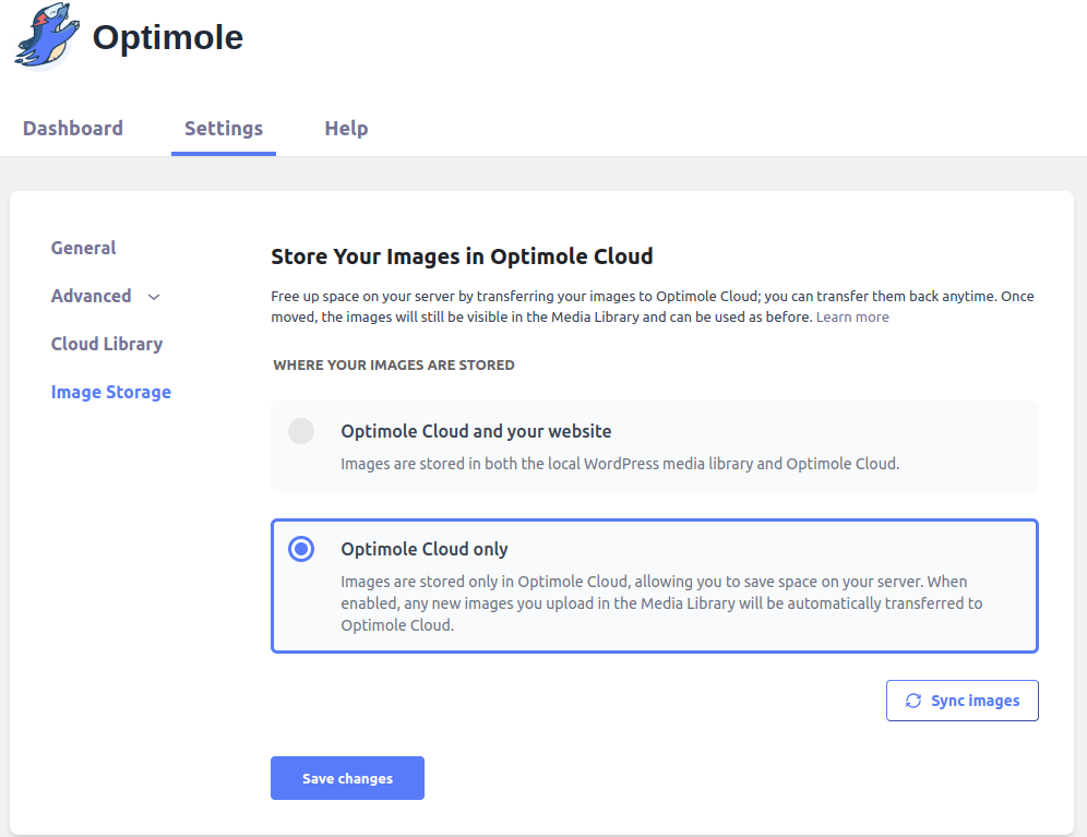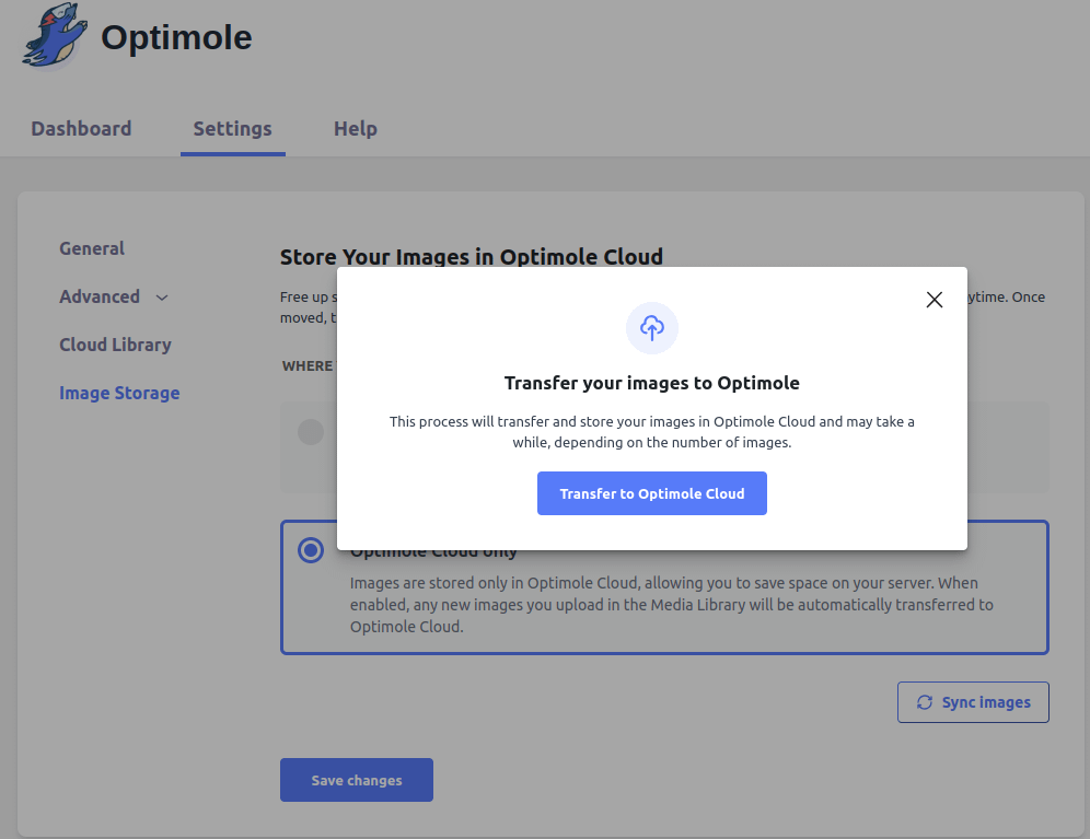 🗒 Hinweis: Wenn einige Bilder noch auf Ihrem Server verbleiben, klicken Sie auf die Schaltfläche Bilder synchronisieren, um diese Bilder in die Optimole-Cloud zu verschieben.