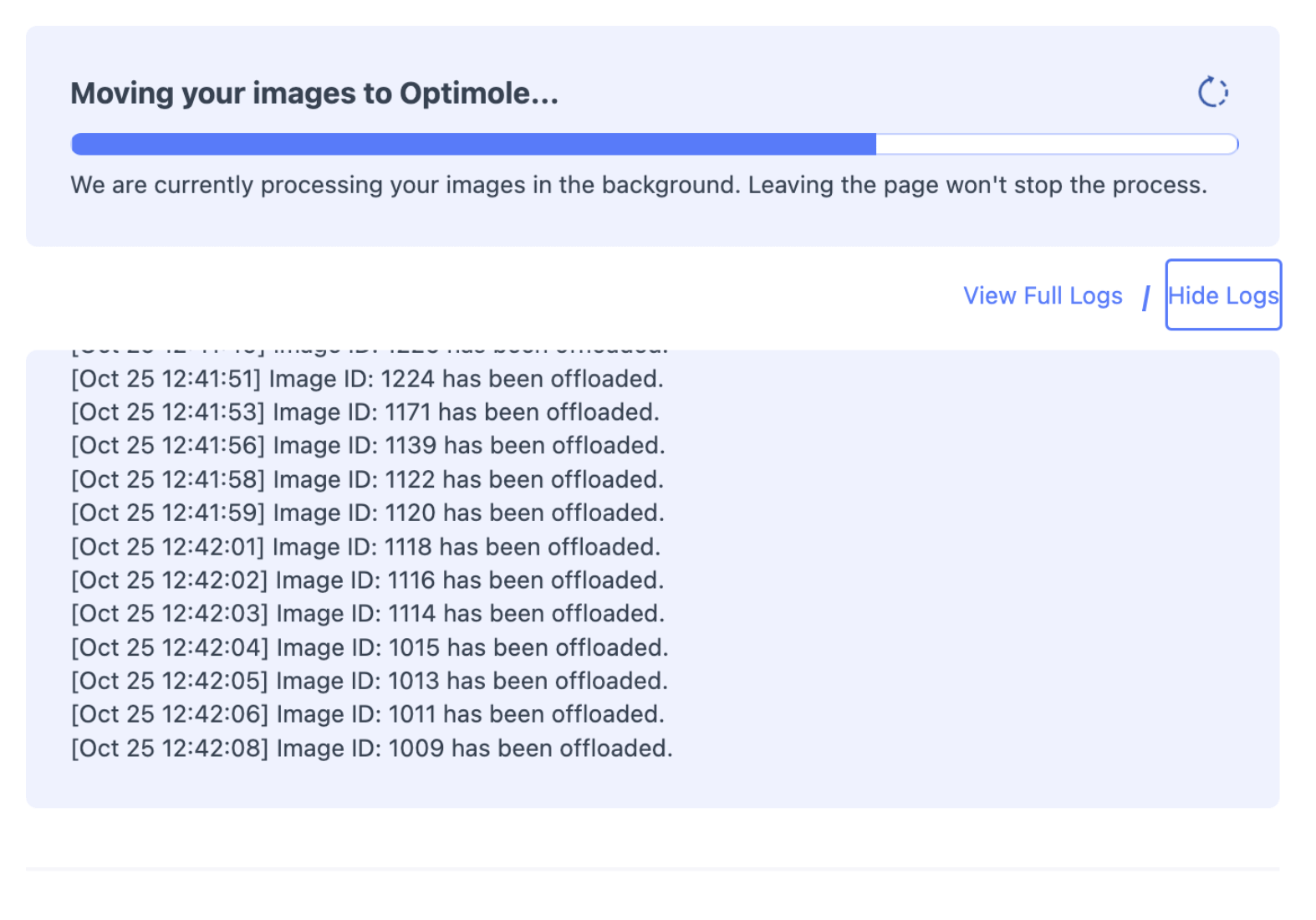 Nach der Bestätigung erhalten Sie die geschätzte Zeit, bis dieser Vorgang abgeschlossen ist. Sie können auch die Schaltflächen Vollständige Logs anzeigen/Logs anzeigen verwenden, um die Transfers in Echtzeit zu verfolgen.